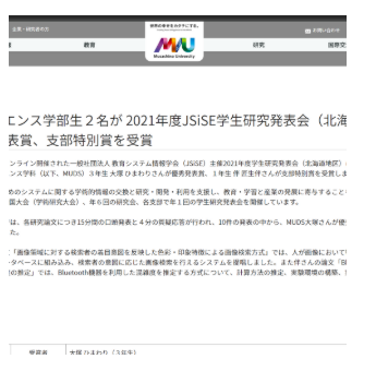 2022/3/3, 大塚ひまわり, 林康弘,清木康, “画像領域に対する検索者の着目意図を反映した色彩・印象特徴による画像検索方式”, JSiSE学生研究発表会, 優秀発表賞, ★, 大塚ひまわり, 学部3年生, 国内学会, https://www.jsise.org/society/presentation/index.html